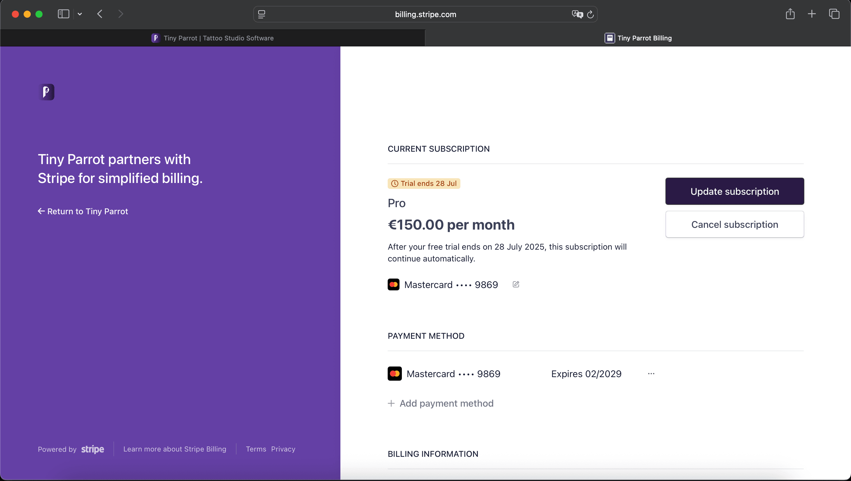 You’ll be redirected to the Stripe portal, which shows your active subscription details.
